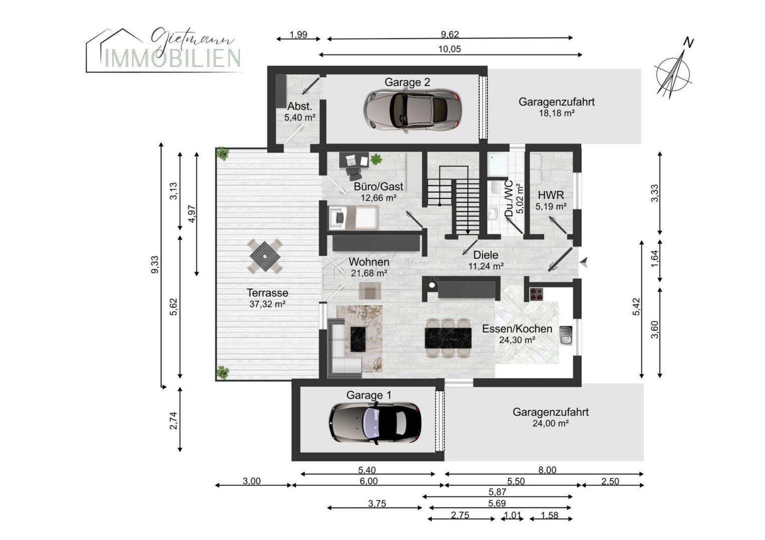 Ein besonderes Highlight ist die großzügige, überdachte Südwest-Terrasse mit ca. 37 m² Fläche – perfekt für sonnige Nachmittage und entspannte Abende. Der Garten ist pflegeleicht angelegt und verfügt über ein Hauswasserwerk mit Brunnen zur Gartenbewässerung. Zwei Garagen bieten ausreichend Platz für Fahrzeuge und zusätzlichen Stauraum. Ein Glasfaseranschluss rundet das moderne Wohnkonzept ab.