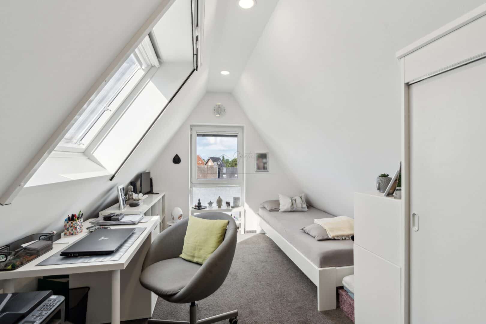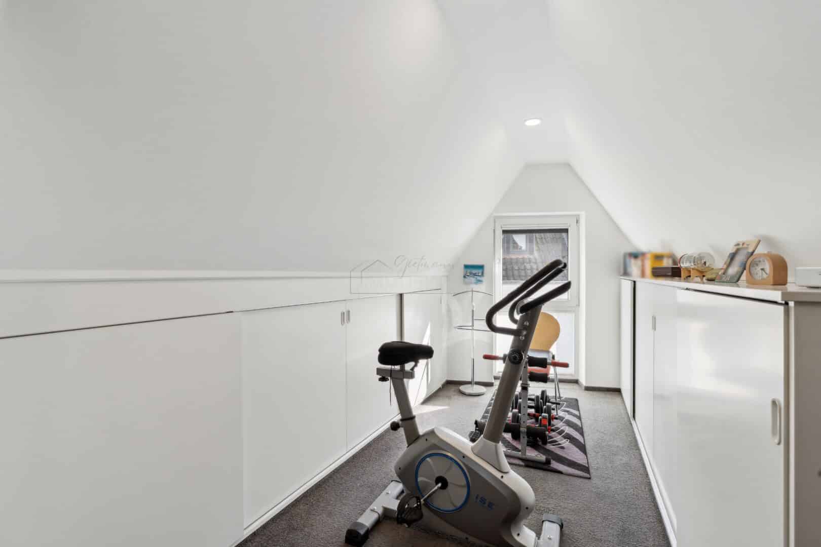 Im ausgebauten Dachgeschoss befindet sich neben der Heizung und einer offenen Empore zwei flexibel nutzbare Räume mit jeweils ca. 11,5 m². Diese eignen sich ideal als Homeoffice, weiteres Kinderzimmer, Gästezimmer oder begehbarer Kleiderschrank. Zudem sind maßgefertigte Einbauschränke in den Dachschrägen vorhanden, die zusätzlichen Stauraum schaffen.
