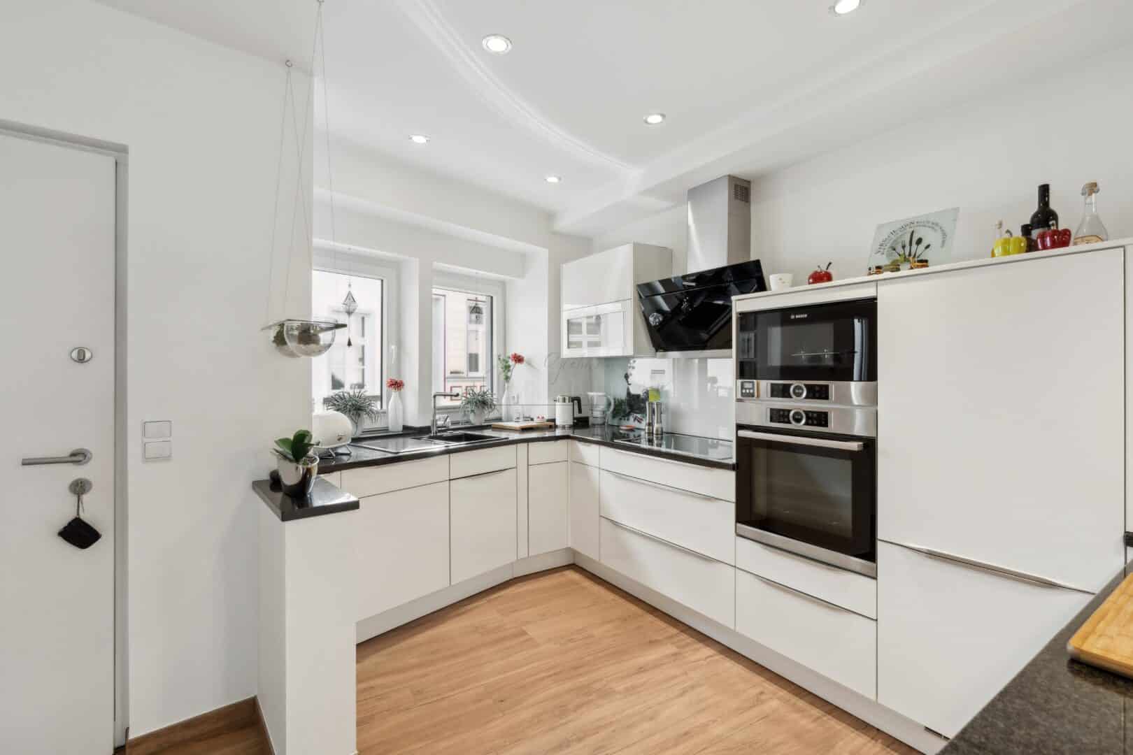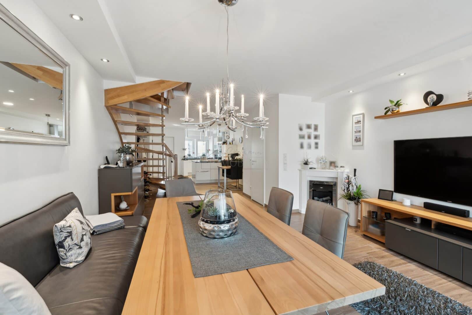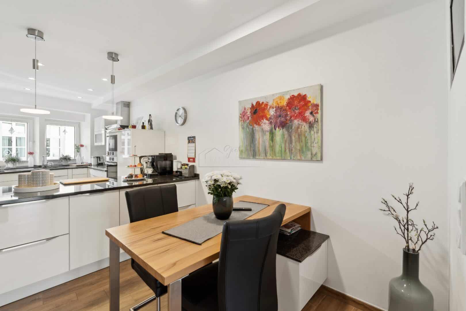 Im Erdgeschoss besticht der Wohnbereich mit hochwertigen Fliesen in Holzoptik, die Küche ist mit einer modernen Einbauküche inklusive Bosch-Geräten und Granit-Arbeitsplatte ausgestattet. Ein maßgefertigter Esstisch und eine in die Küche integrierte Waschmaschine unterstreichen das durchdachte Raumkonzept.