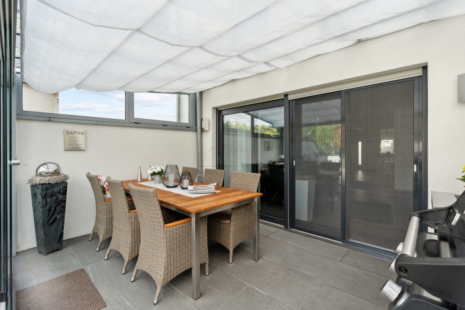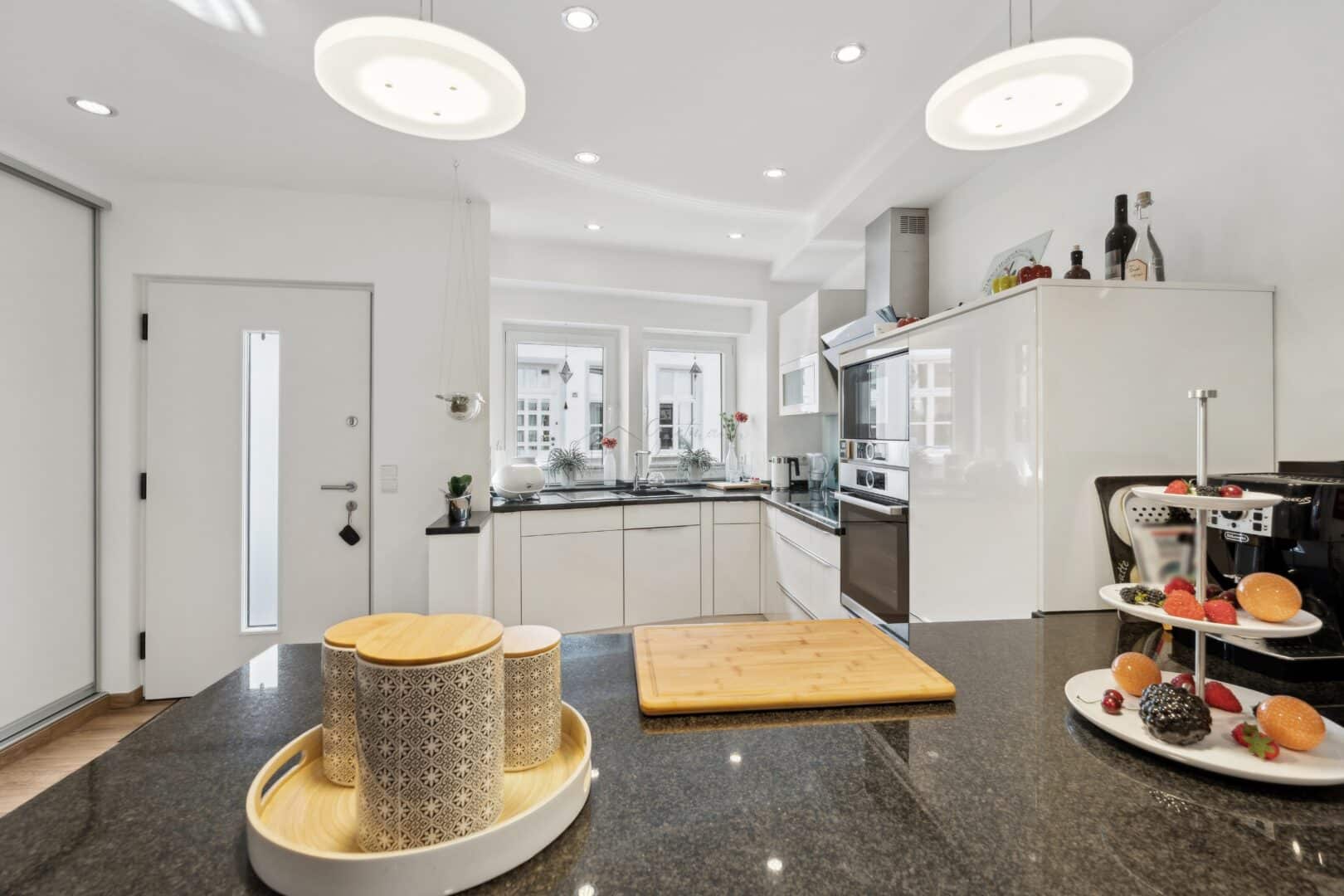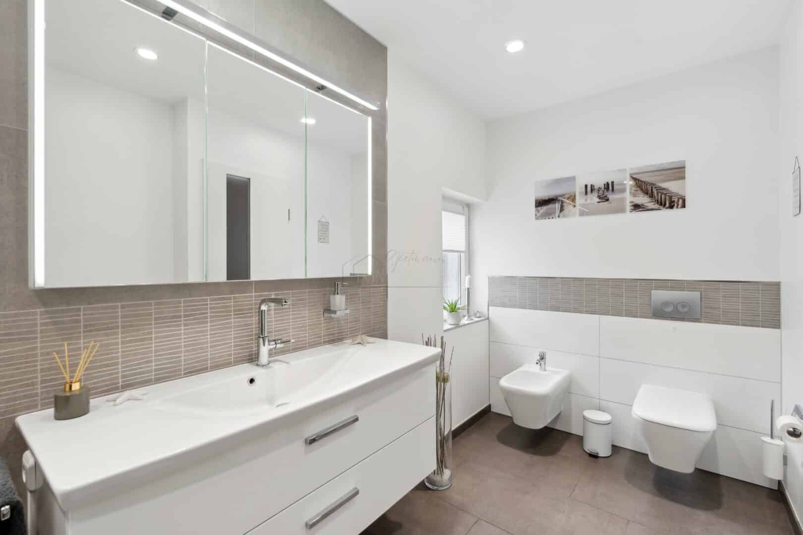 Im Erdgeschoss besticht der Wohnbereich mit hochwertigen Fliesen in Holzoptik, die Küche ist mit einer modernen Einbauküche inklusive Bosch-Geräten und Granit-Arbeitsplatte ausgestattet. Ein maßgefertigter Esstisch und eine in die Küche integrierte Waschmaschine unterstreichen das durchdachte Raumkonzept.